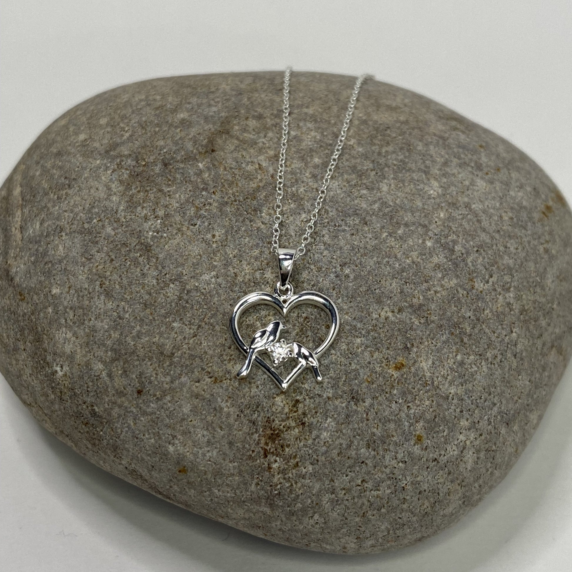 A sentimental, romantic Sterling Silver Love Birds Heart Necklace. Hallmarked '925', 1.8 grams. Chain length - 17.5 inches.